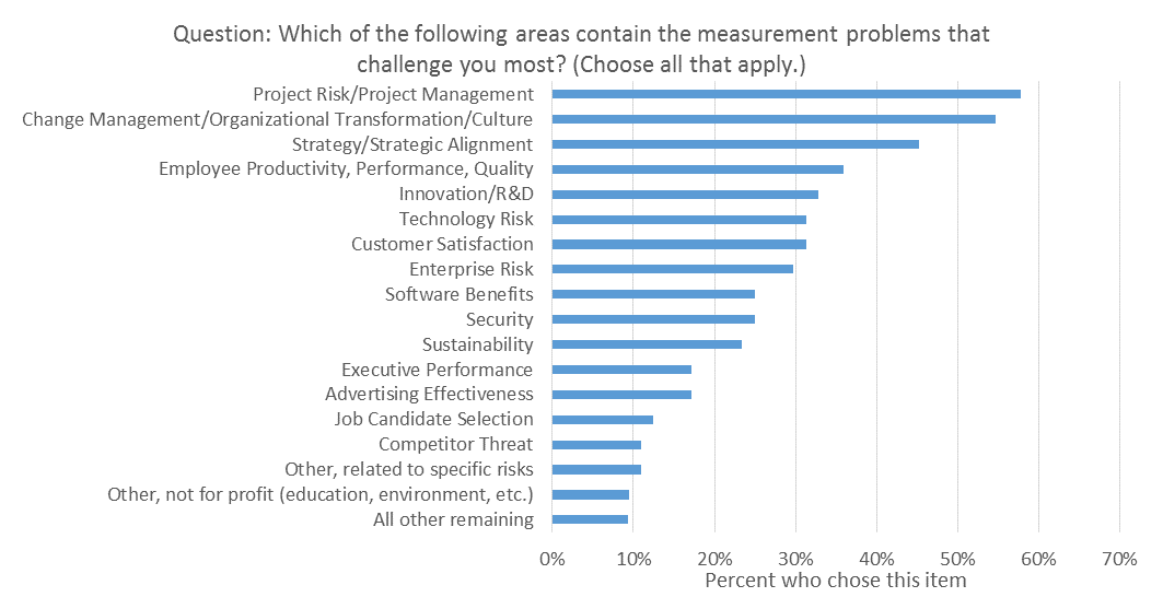 According to our recently completed “Measurement Challenges” survey, project risk and project management-related issues are the #1 most frequently identified measurement challenges, followed closely by change management and organizational transformation.  The survey also showed that while only half have received training to address these problems, the majority feel they need training in statistical methods or even the analytical methods provided in Excel. This is a brief summary of the findings of that survey.