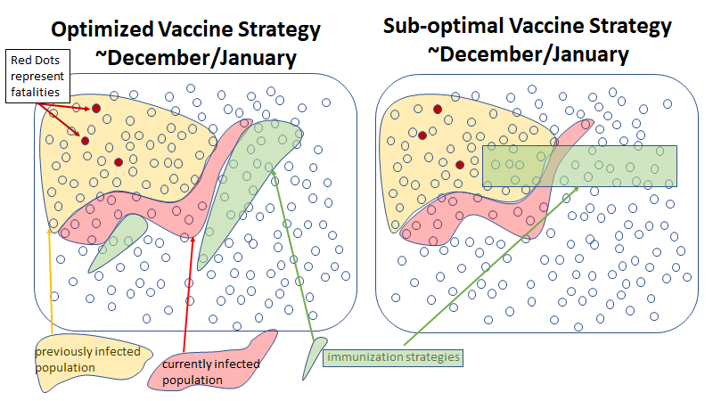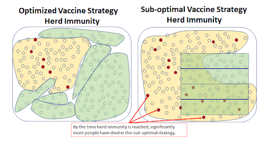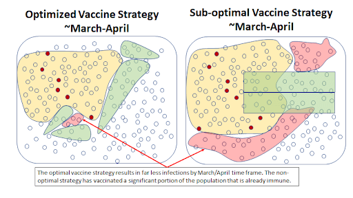 The charts below show how the virus may spread with an optimized strategy vs. a less effective strategy. In the less effective strategy, some vaccines are wasted on individuals who already have antibodies. In addition, the sub-optimal strategy would not attempt to identify recipients for the vaccine as a function of how likely they are to spread the virus to others.