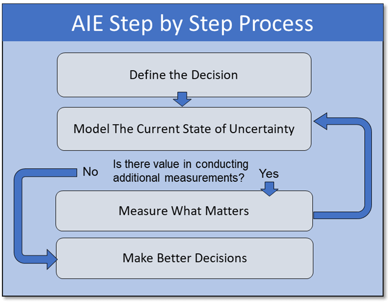 Fortunately, the company I work for Hubbard Decision Research (HDR), specializes in making decisions given many uncertain factors. Applied Information Economics (AIE), developed by HDR’s founder Douglas Hubbard, provides a practical statistical framework for making this decision or others with high degrees of uncertainty. It employs methods proven by a large body of peer-reviewed academic research and empirical evidence on improving human expert judgments. As a management consulting firm, we are routinely hired by some of the world’s largest companies and government organizations to apply this framework to large difficult decisions. The same framework can be applied to personal financial decisions in a 4-step process.