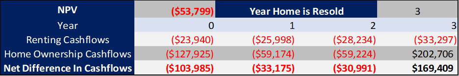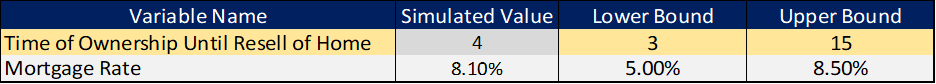To model this decision, a Monte Carlo simulation was used to generate 1,000 different possible scenarios based on defined probability distributions for the variables that influence the decision. This may sound complicated at first glance. References to simulations bring up mental images of the Matrix or Dr. Strange using the Time Stone to see 14 million different simulations and only one way to defeat Thanos. But when explained, it’s quite straightforward. Rather than using a fixed value for a variable I’m unsure about such as “Time until reselling of home”, I use a range with a confidence interval. I’m not sure how long I would potentially live in the apartment, but I’m 90% sure it would be between 3-15 years. While I may not possess an infinity stone to see all these simulations, I do possess a tool equally as powerful for practical decision-making: Excel. In Excel, standard cashflow models were built to show how my financial inflows and outflows would compare if I rented or bought one of the apartments, and the net present value (NPV) of the difference was calculated.