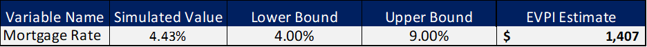 By measuring and ranking EVPIs, we obtain a practical list of the most important uncertain variables to spend time measuring or conducting additional analysis on. If initially, I’m unsure what my mortgage rate would be and give a 90% confidence range of between 4-9%, the maximum I would be willing to pay a bank to give me a precise mortgage quote guarantee would be the EVPI. In this case $1,407.