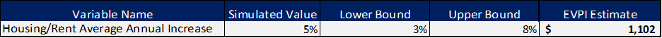 Changing the mortgage rate from a range to a constant also changes the EVPIs of other variables. While in the original model, I had 4 variables with EVPI values, the updated model shows the only variable worth conducting additional measurement on is the estimated annual increases in home prices over the period of ownership. Unfortunately for me, I do not have a magic crystal ball, nor an oracle I can con pay to tell me precisely what home prices will do in the future. I could spend hours researching the market mechanisms of home price increases to come up with narrower range estimates for the lower and upper bounds. However, based on the EVPI, I do not think the slight reduction in uncertainty is worth it. I can confidently move on to making my decision.