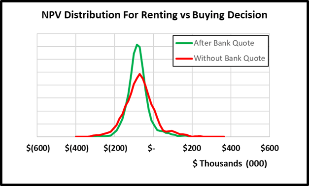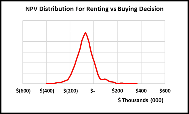 Based on the recorded simulated values and cashflows, the model generates a probability distribution for possible NPVs, which will suggest an informed decision. If the expected NPV (average NPV across all situations) is positive, the decision should be to buy; if it is negative, the decision should be to rent.