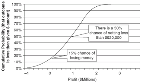 We’ll say these numbers fall into a 90% confidence interval with a normal distribution. There are a lot of possible outcomes, to put it mildly (and this is a pretty simple business case). Which are the most likely? In the book, Doug used an MC simulation to run 10,000 simulations – or 10,000 scenarios – and tallied the results for each (with each scenario representing some combination of demand and profit per widget to create a loss or gain). The results are described by two figures: a histogram of outcomes (figure 1) and a cumulative probability chart (figure 2)<fn>Hubbard, D. W. (2009). The failure of risk management: Why its broken and how to fix it. Hoboken, NJ: J. Wiley & Sons.</fn>: