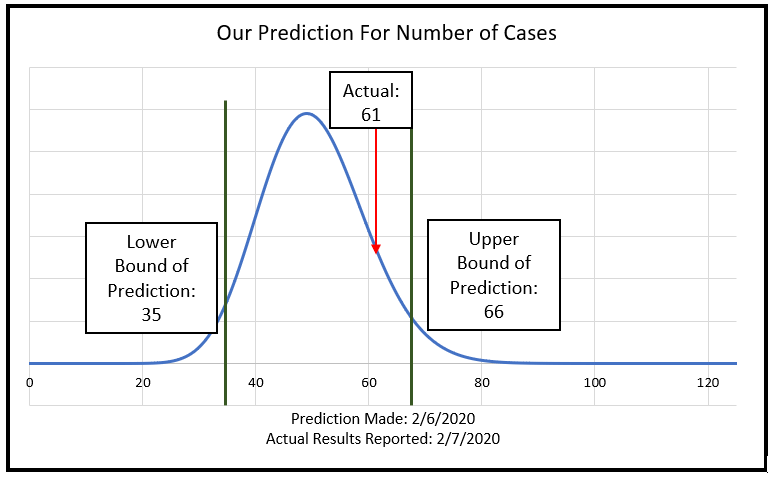 On 2/6/2020, we estimated that the total number of positive test results from the first 273 samples would be between 35 and 66. Today, 2/7/2020, the testing was completed and reported – and the number of samples that tested positive (61) fell within our estimated range (see Figure 1 below).