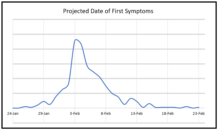 Figure 2: Projected date of first symptoms of 2019 n-CoV on Diamond Princess, given no infections after the 2/3/2020 quarantine. (No y-axis value is given since a wide range of total infections is possible).