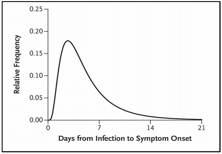 Put another way, if one or two individuals could start a chain reaction on 1/21/2020 that created 61 symptomatic passengers by 2/2 – 12 days later – how many people would those symptomatic passengers have infected in the days before the quarantine? The answer to this question lies in knowing the average and distribution of the incubation period.